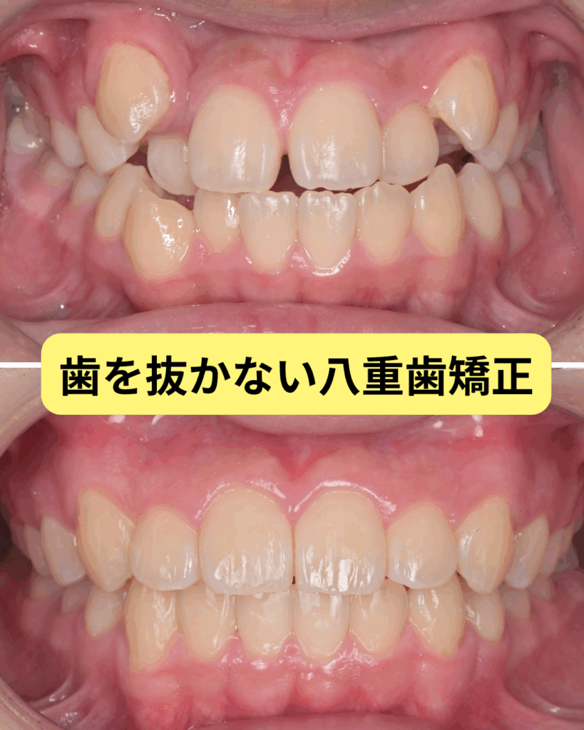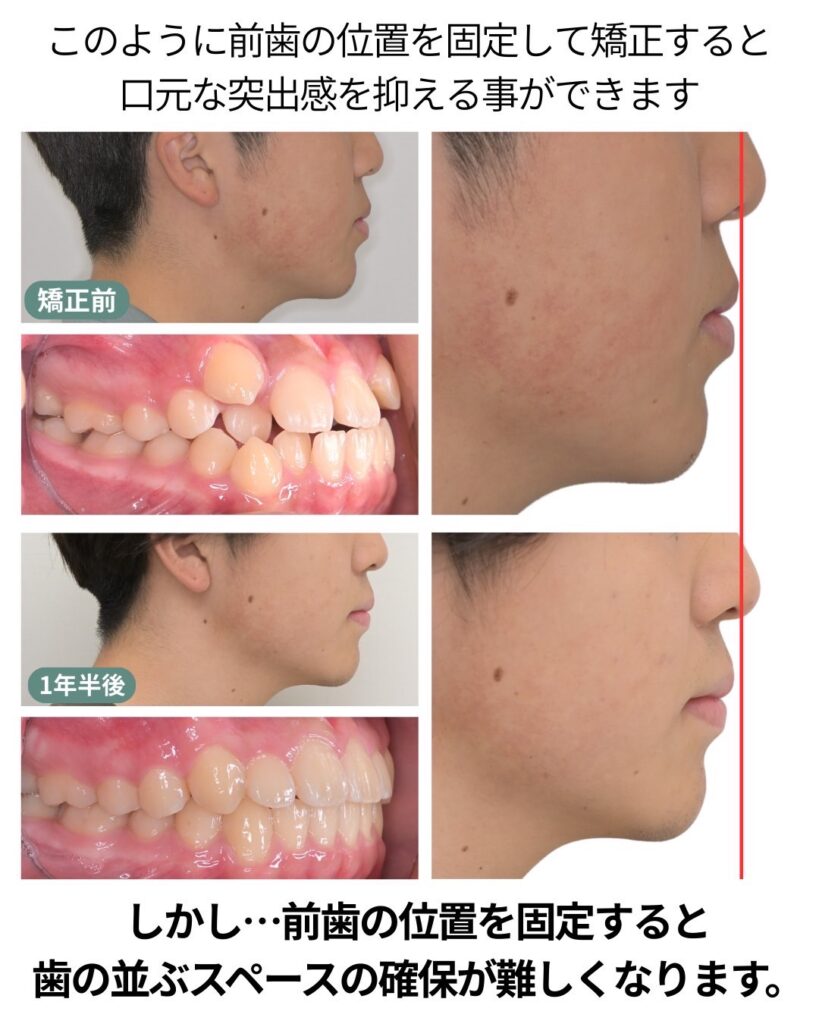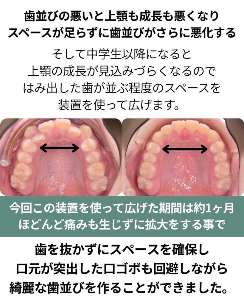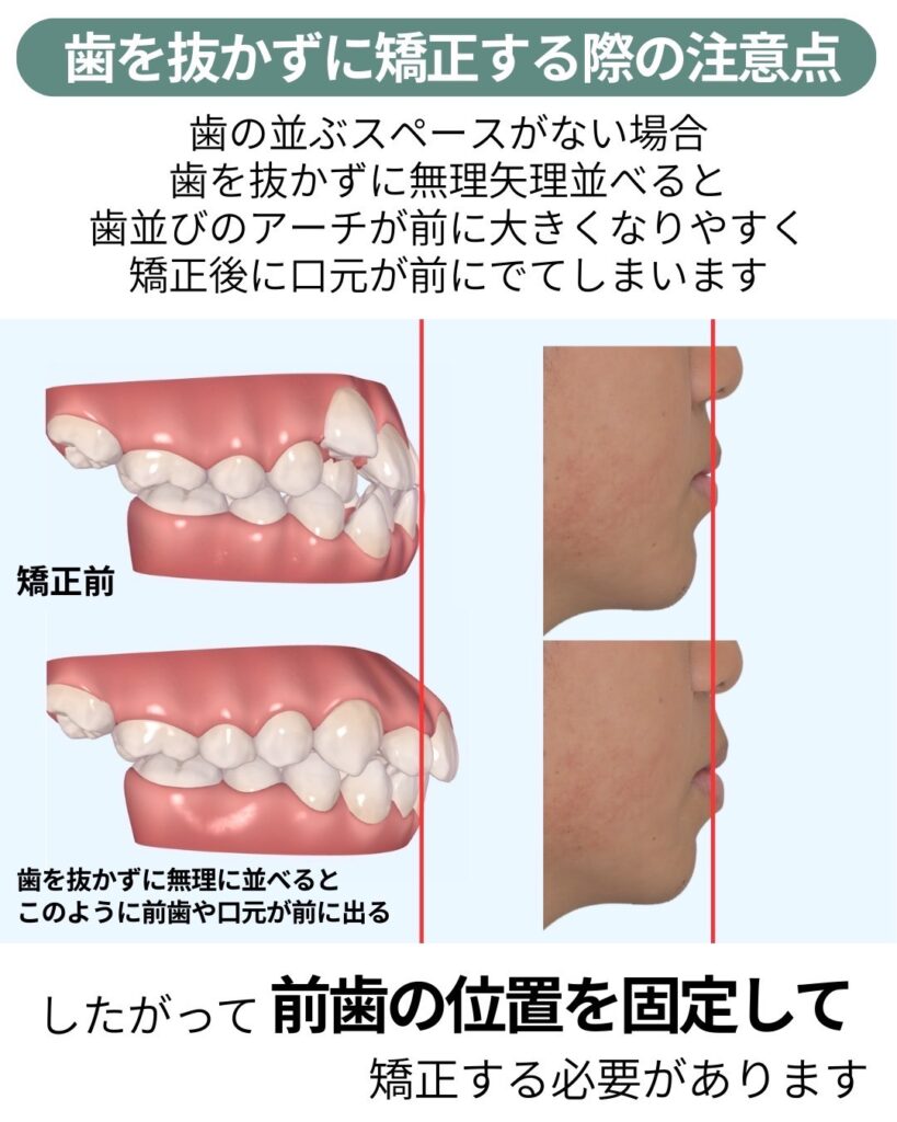 当院ではそうならないように、遠心移動と側方拡大を行い、出っ歯や口ごぼにならないように並べます。