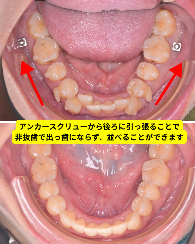 当院では、アンカースクリューを使用して歯列全体を後方(遠心)に移動させることで、 歯を抜かずに、出っ歯にせず治療することが可能です。
