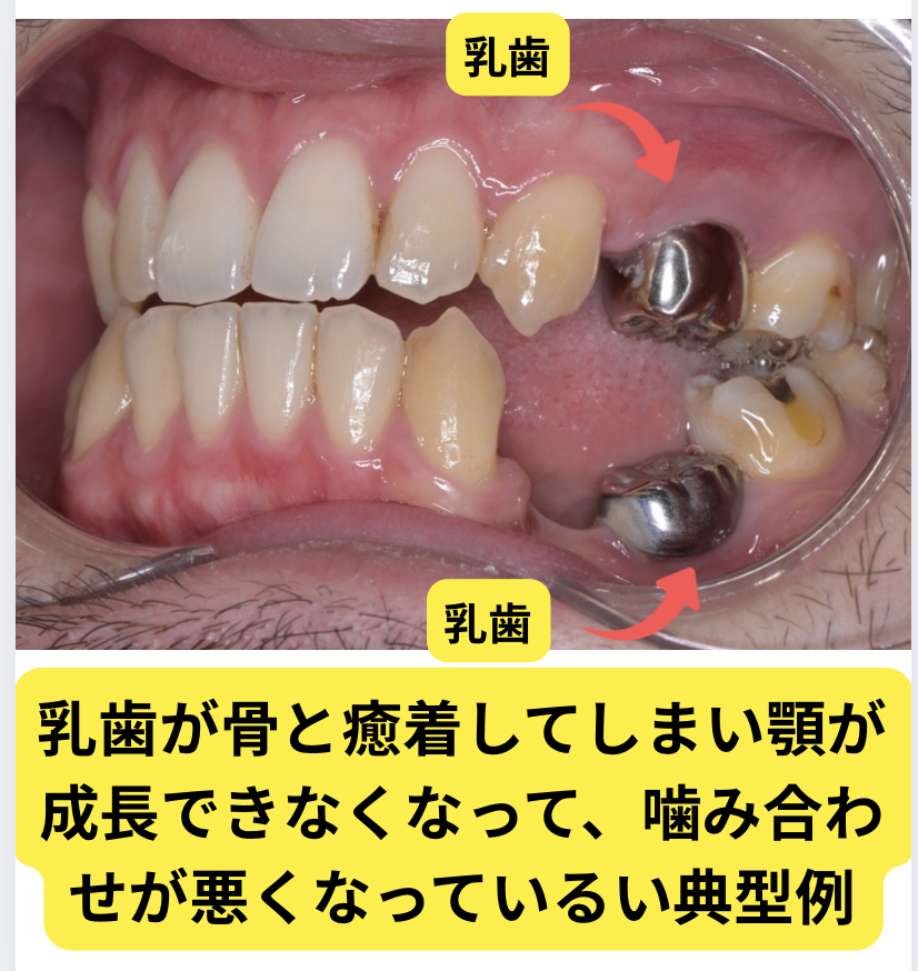 虫歯治療をしている乳歯や神経をとっている乳歯を残したままにすると、骨と癒着してしまう場合があります。成長期にこれが起こってしまうと骨が正く成長せずに、骨格の問題が生じてきます。またこうなってしまった場合は抜けた時にインプラントをする場合とても難しくなってしまします。